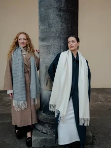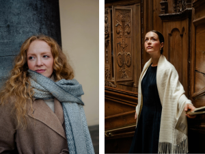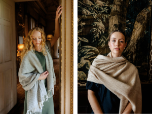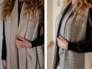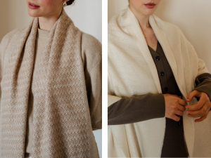 These exclusive designs will be available in scarves and shawls, woven in natural undyed alpaca shades of caramel, grey, and white.